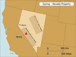 The Spring Property consists of five mineral claims, covering approximately 103 acres, located in Mineral County, Nevada. The claims that form the property cover gold mineralized skarns and jasperoids within Triassic Luning formation and adjacent quartz monzonite intrusive bodies in a geologic setting very similar to the Company's Golden Mile Project located nine miles to the South. Past exploration by Canyon Resources and Bond Gold in the 1980's demonstrated widespread gold mineralization with grades up to 8.3 gpt along 3 meters. The property will be re-evaluated in conjunction with the Company's ongoing exploration program at Golden Mile.