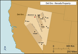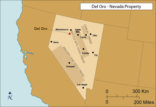 The Del Oro Property is located approximately 46 km (29 miles) south of Winnemucca, in the East Range, Pershing County, Nevada. It is approximately 6.4 km (4 miles) northwest of the Goldbanks deposit held by Kinross/Desert Gold and about 90 m (300 ft) west and northwest of the Barrick held Rye Project.